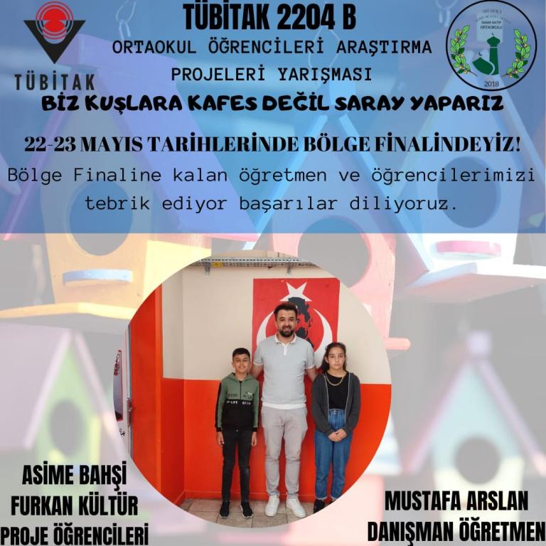 2022-2023 Eğitim Öğretim yılında Tübitak 2204-B proje yarışması Tarih dalında hazırladığımız ''BİZ KUŞLARA KAFES DEĞİL SARAY YAPARIZ'' Adlı projeyle Van Bölge finaline katılmayı hakettik. Emeği geçen Danışman Hocamız Mustafa ARSLAN , Öğrencileri Furkan KÜLTÜR ve Asime BAHŞİ'ye teşekkür ederiz.